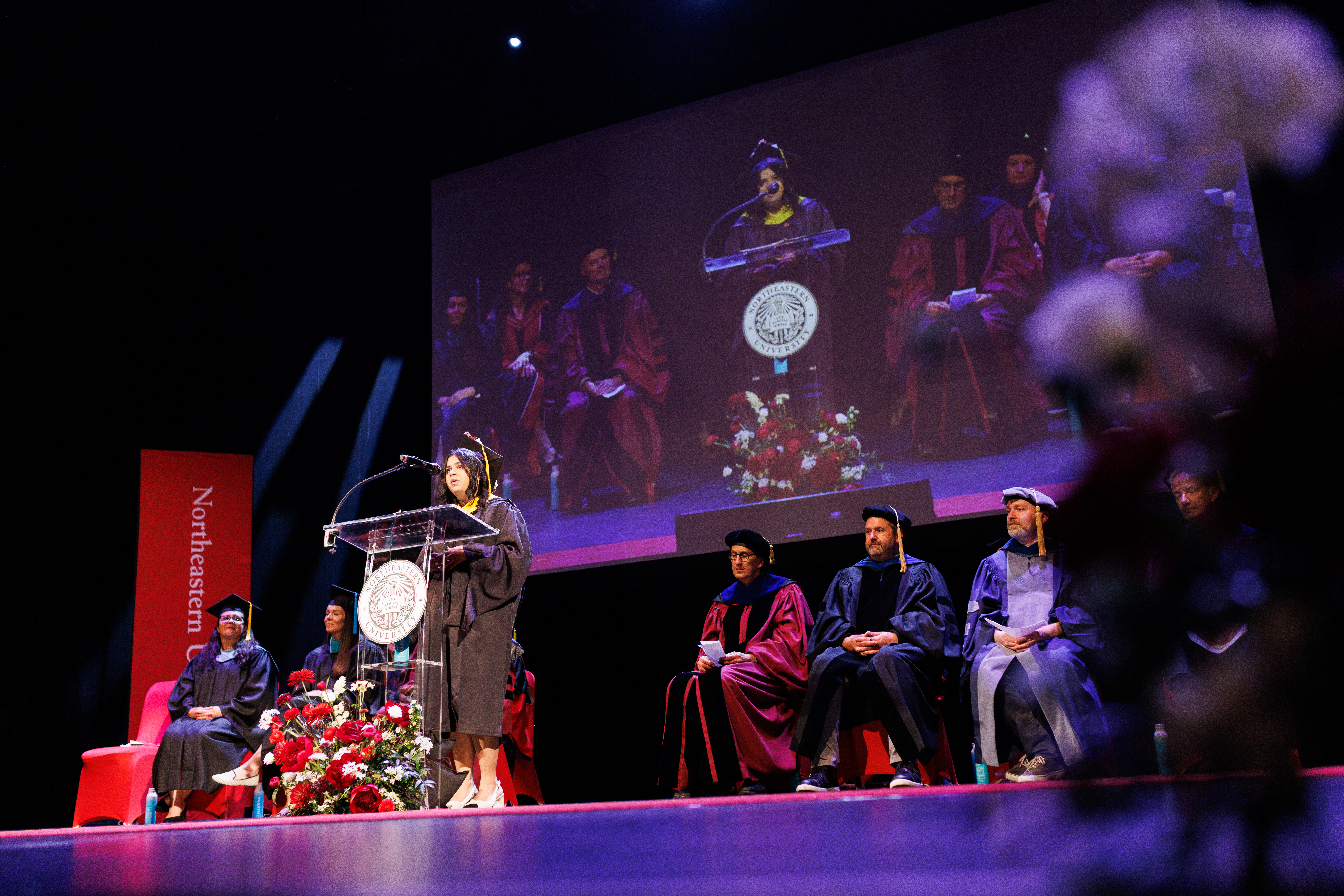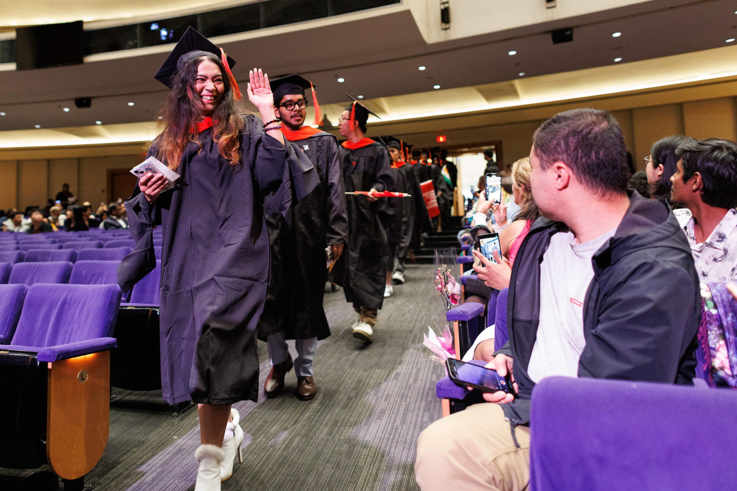 Students waving their international flags.Graduate takes a photo in front of the Northeastern logo.Graduates taking a selfie.Graduates processing into the Centre.Graduates gather to toss their caps.Student Speaker Anvita Vyas delivers her address.